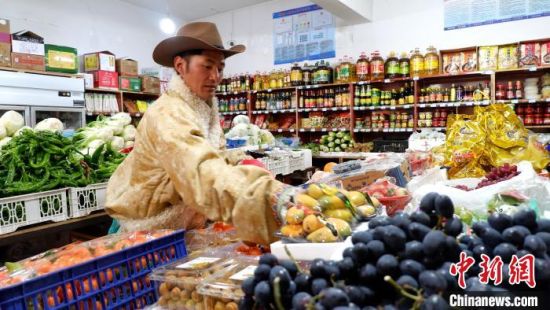 2月27日藏历新年,青海省海北州刚察县牧民土旦占斗在水果蔬菜店买水果。 李隽 摄