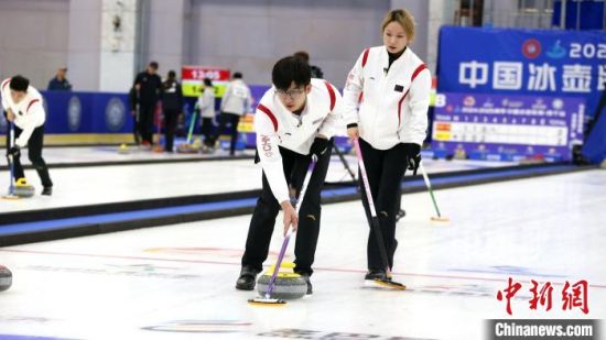 3月10日,黑龙江省冰上训练中心四队队员进行混双比赛。张忠苹 摄