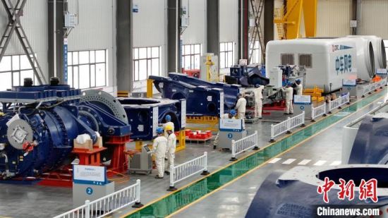 图为2025年5月11日,车间工人组装高原风电机组。(中国中车供图)