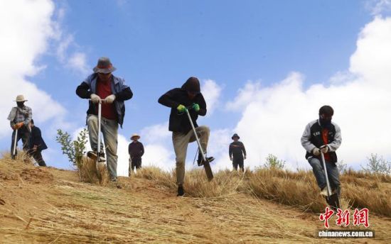 资料图为青海省海南藏族自治州贵南县黄沙头国家沙漠公园内,当地民众参与沙漠治理,铺设草方格。 马铭言摄