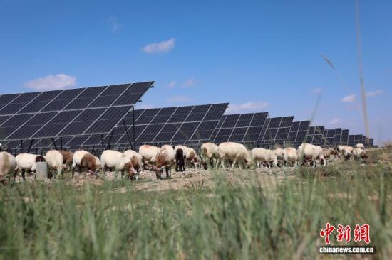 资料图为青海省海南藏族自治州共和县塔拉滩光伏产业园区内,“光伏羊”在光伏板下吃草。 马铭言摄
