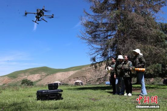 图为祁连山国家公园(候选区)青海片区青阳沟管护站队员用无人机开展巡护。薛蒂 摄