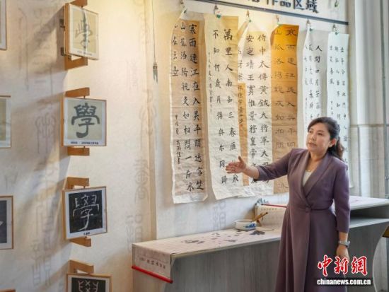 图为贾永蓉介绍学生的书法作品。 祁增蓓摄