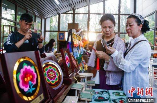 图为民众了解国家级非物质文化遗产代表性项目土族盘绣。 马铭言 摄
