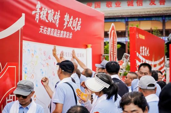会场中央,一面“挚友七彩留印墙”成为全场焦点,吸引了挚友们纷纷驻足,这面墙以绚丽的色彩为底,象征着天佑德与各位挚友之间多彩斑斓的情谊。温度在此、刻度留痕,每一个手印,都将成为一份独特的印记,挚友们手持专属印泥,在墙上按下自己的手印,一个个独特的印记逐渐汇聚成一幅完整的“同心画卷”。这面留印墙不仅是情谊的见证,更承载着天佑德与挚友们“共成长、同发展”的初心。墙上的每一个手印,都是一段故事的开始;每一种色彩,都代表着一份信任与期待。