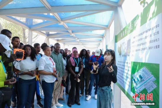 9月12日,非洲青年在青海省海南藏族自治州共和县塔拉滩光伏产业园区内了解清洁能源发展成效。 马铭言 摄
